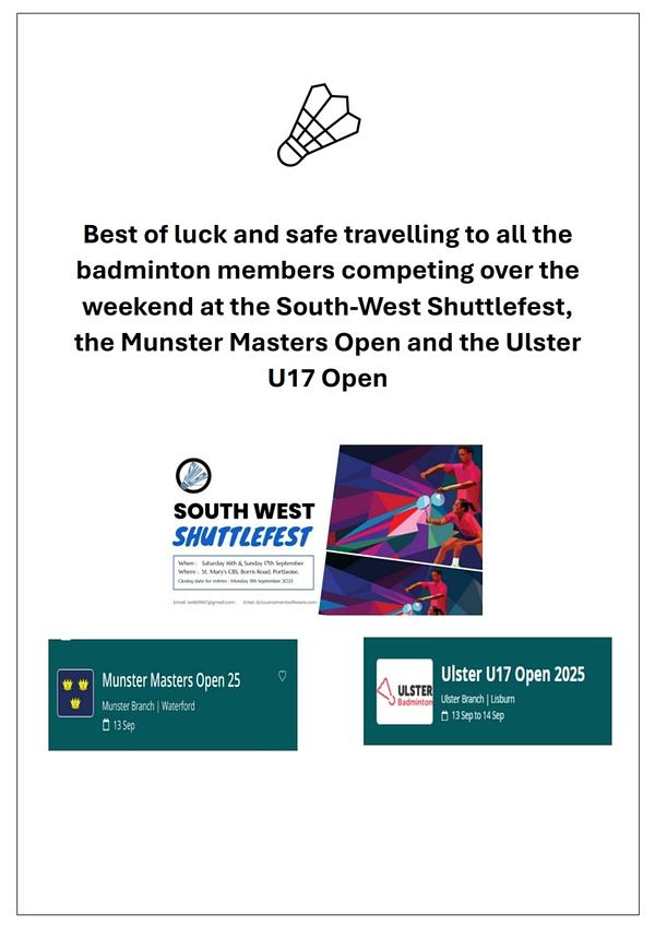 Best of luck to all our players taking part in the South-West Shuttlefest, the Munster Masters Open and the Ulster u17 Open! πΈπ₯