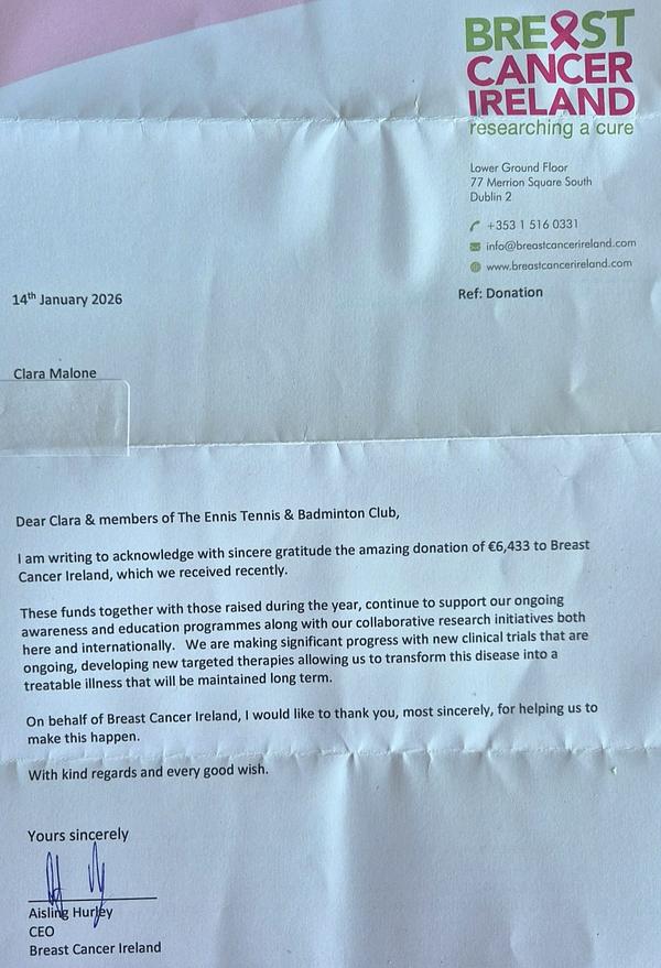 A lovely acknowledgement recently received by our Pink Tennisathon Committee of the magnificent work put in by them for the Smash Cancer event held at the start of November. 🙌🏼