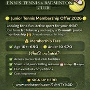 Ennis Lawn Tennis & Badminton Club are offering a fantastic Junior Membership Offer!Get 15...